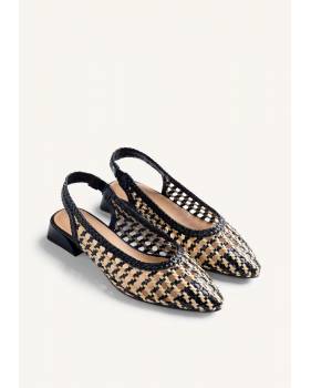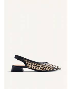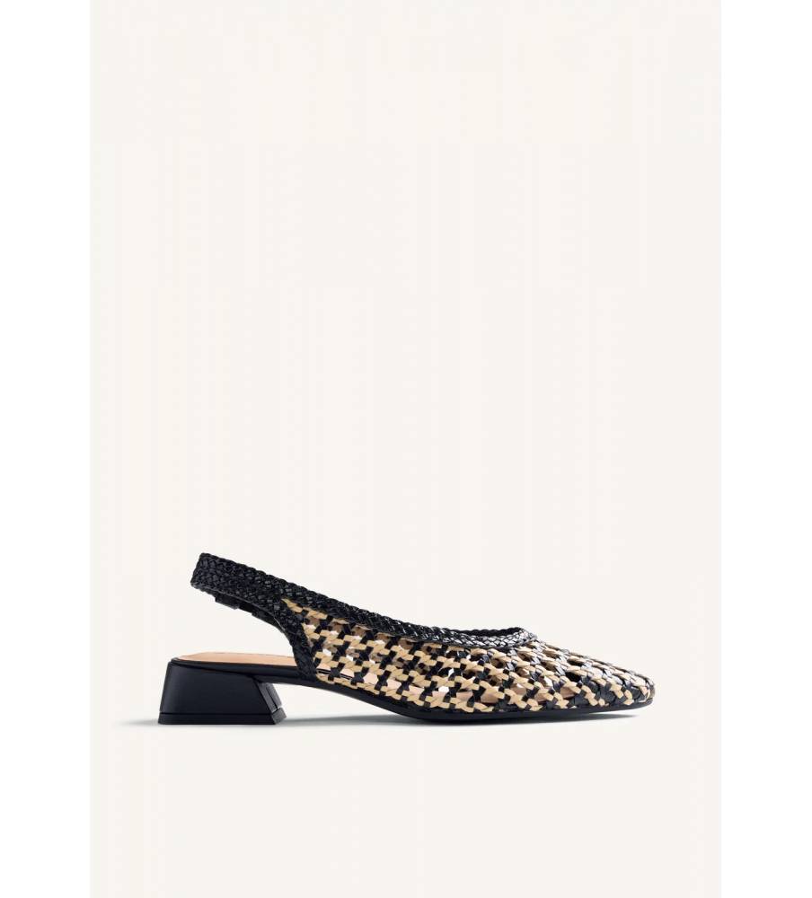 Scarpe con tacco stile court aperte realizzate in pelle intrecciata a mano. Punta affusolata. Tacco a blocco trapezoidale con finitura metallizzata. Presentano una soletta imbottita ed elastico alla caviglia. Altezza tacco: 3 cm.