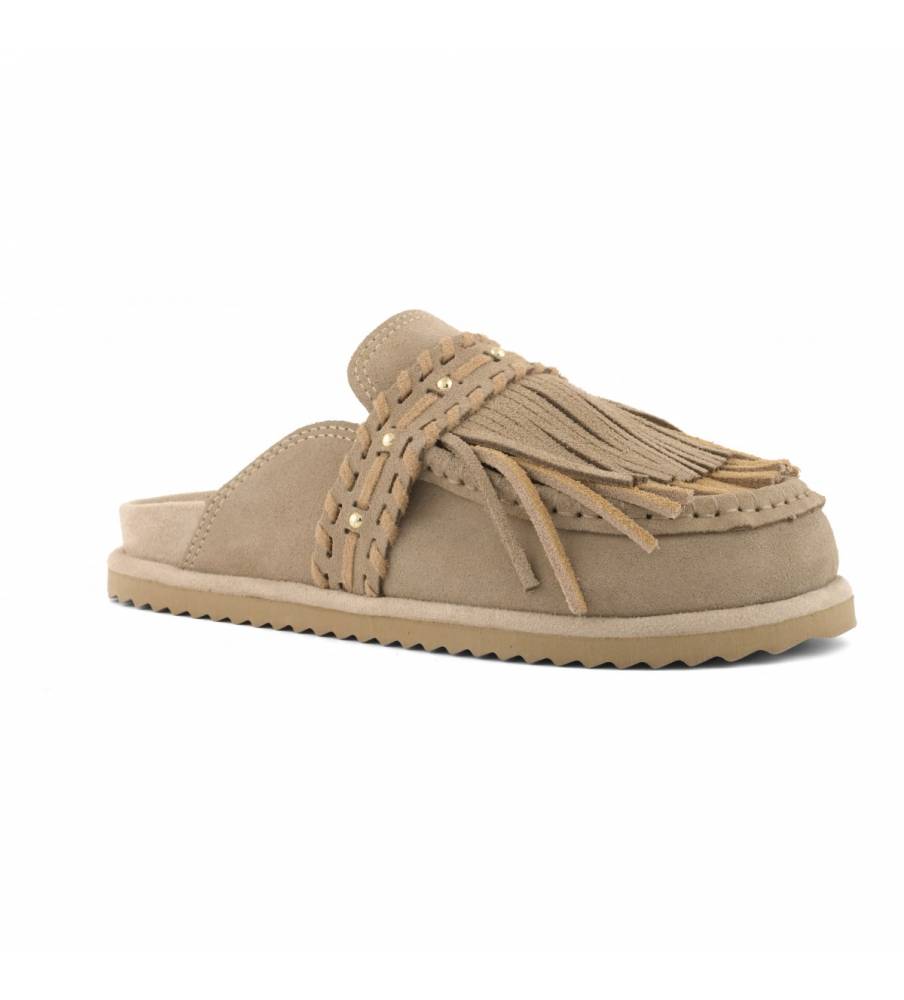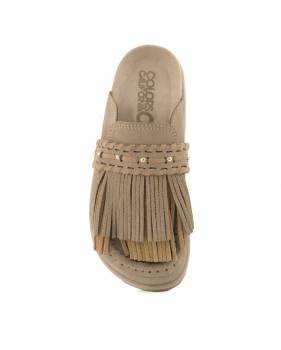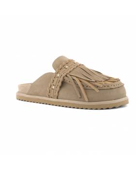 Sabot in pelle scamosciata dalla texture morbida e avvolgente, pensato per esprimere uno stile libero e autentico. La tomaia è arricchita da una cascata di frange fluide che crea un effetto dinamico e ricco di carattere. È impreziosita da cuciture a contrasto e borchiette metalliche, dettagli che richiamano la tradizione artigianale e l’estetica navajo. Un modello dal gusto tribale sofisticato, ideale per valorizzare i look estivi con personalità.