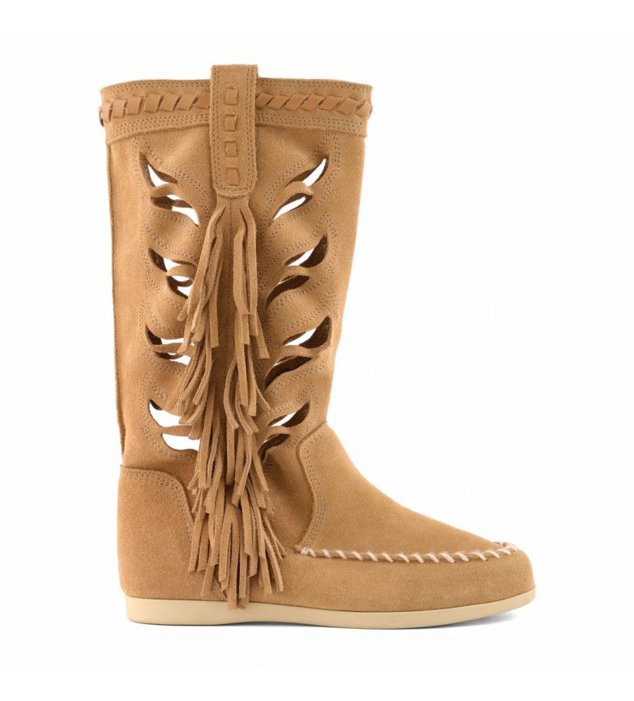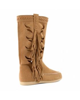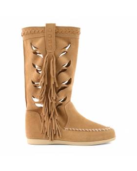 Stivale estivo in morbida pelle scamosciata, caratterizzato da una tomaia traforata e le lunghe frange laterali donano movimento e un deciso richiamo etnico.